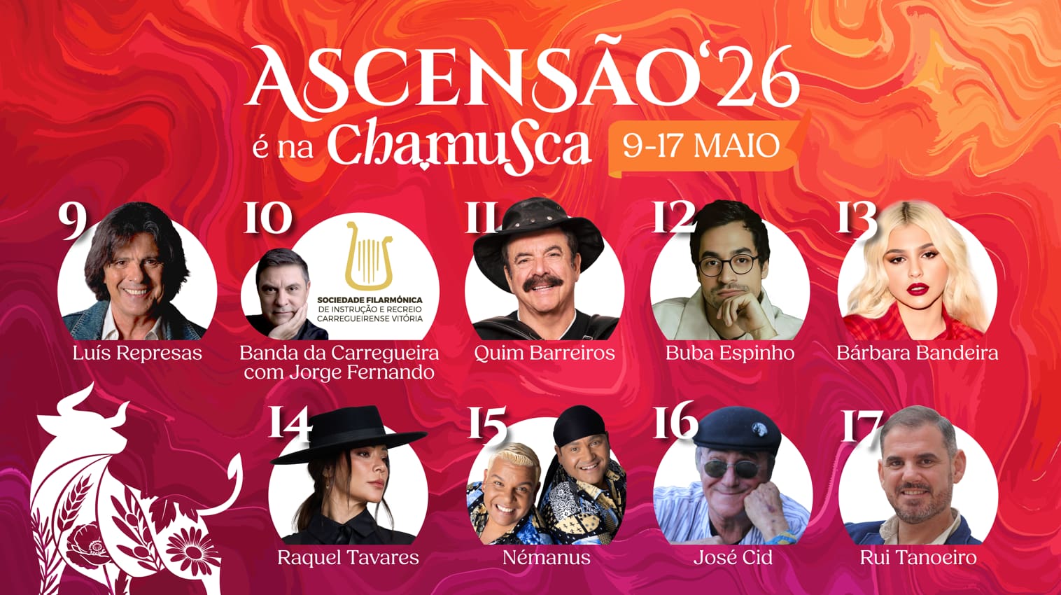 A edição de 2026 apresenta um cartaz de referência que cruza gerações, estilos e públicos, reforçando a dimensão cultural da Ascensão. Entre os cabeças de cartaz estão Luís Represas, Banda da Carregueira com Jorge Fernando, Quim Barreiros, Buba Espinho, Bárbara Bandeira, Raquel Tavares, Némanus, José Cid e Rui Tanoeiro.