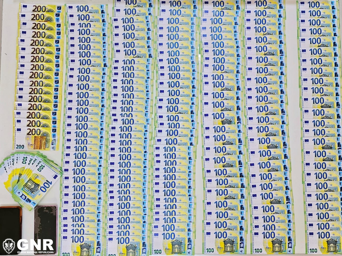 Além de 294 notas de cem euros, e de 19 notas de 200 euros, foram apreendidos dois telemóveis.