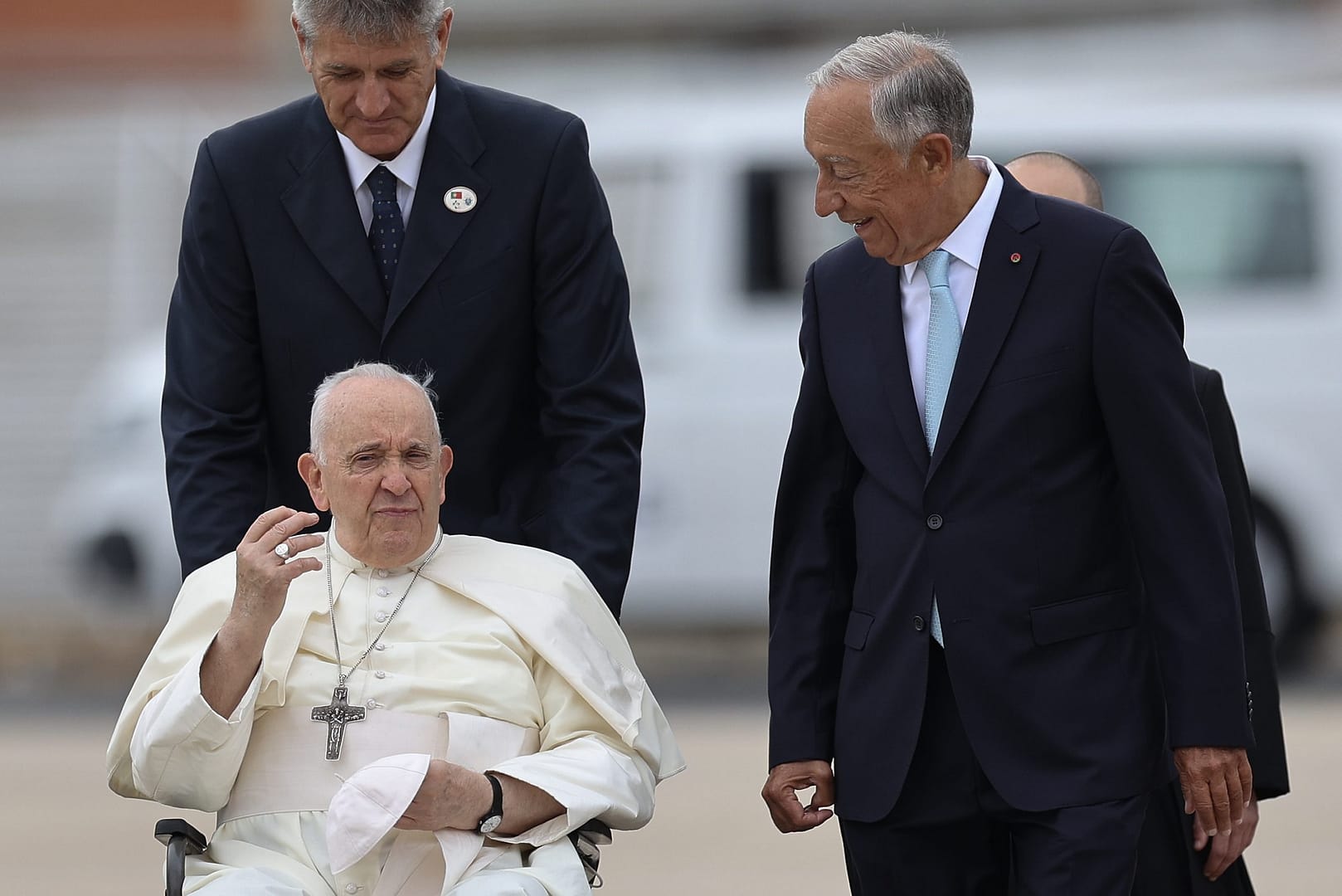 O Papa Francisco é recebido, no aeroporto, pelo Presidente da República, Marcelo Rebelo de Sousa.