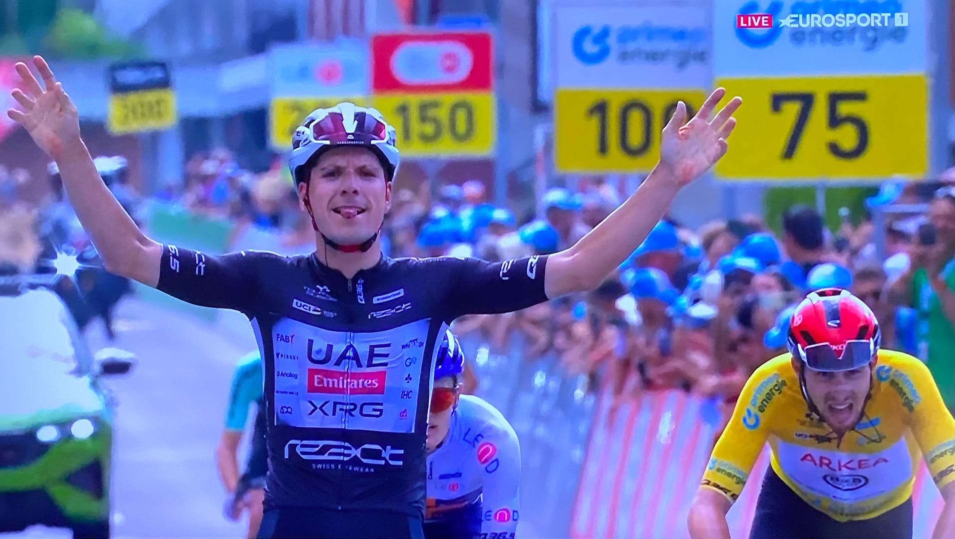 O britânico Oscar Onley (Team Picnic PostNL) terminou em segundo na etapa, à frente de Kévin Vauquelin, que enverga o símbolo de líder há três dias e que lançou um ataque e acelerou a cerca de 350 metros da chegada em subida.